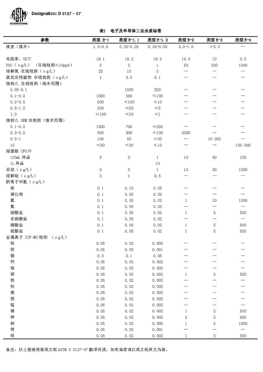 在電子工業的生產工藝中,相當多的工序要進行化學處理,而電子產品的清洗和化學藥劑的制備都直接或間接地要利用到純水或超純水。隨著電子工業的發展,尤其是以超大規模集成電路為代表的半導體產業的發展,對純水的水質提出了更高的要求,下表所列為美國材料測試協會(ASTM)根據半導體特性而制定的超純水水質要求。