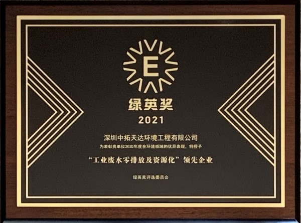 大會舉辦期間,公布了2021年“綠英獎”獲獎名單,深圳中拓環境工程有限公司很榮幸地被授予“工業廢水零排放及資源化 領先企業”獎項。